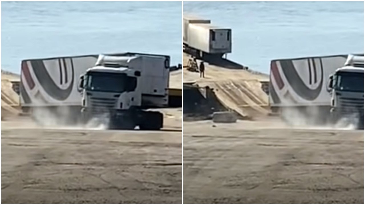 A carreta com origem em Manaus, realizou a travessia de balsa até o anexo da Sociedade de Portos e Hidrovias e na subida da rampa, o veículo acabou quebrando, descendo de ré sem freio em direção ao rio. O motorista conseguiu manobrar e atravessar a carreta parando o veículo em segurança!