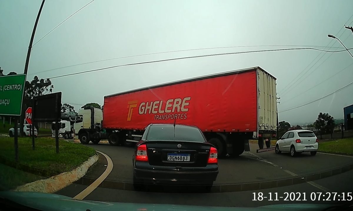 Um carro modelo Jeep tentou atravessar na BR-277 quando não viu que uma carreta cegonha estava vindo em direção a sua lateral.