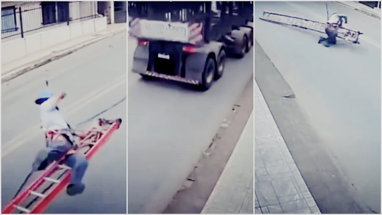As imagens são impressionantes e mostram o homem sendo arrastado como um boneco juntamente com a escada que trabalhava até o final da rua.