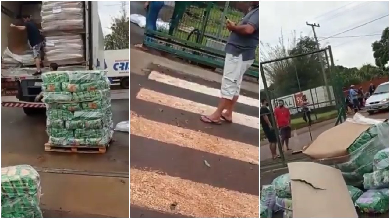 Cansado de esperar, caminhoneiro descarrega a carga que trazia de macarrão no chão.