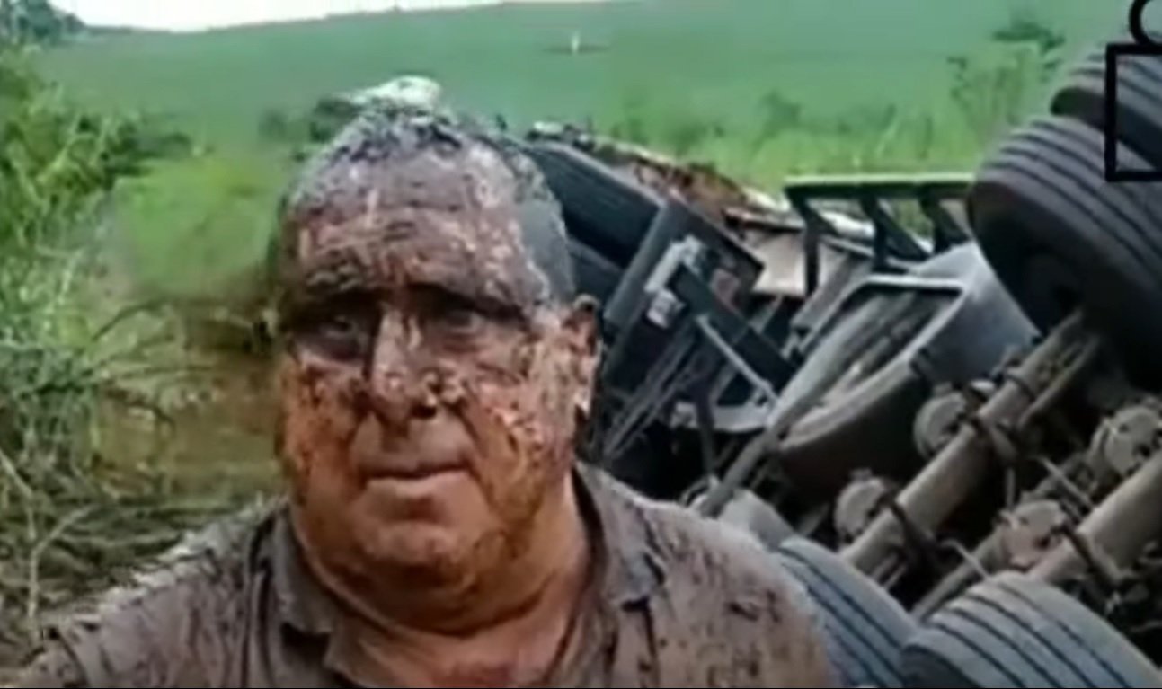 O caminhoneiro também estava coberto por lama e como podemos ver a dinâmica do acidente, ele se livrou por um verdadeiro milagre. Veja o vídeo com as palavras comovente da vítima.