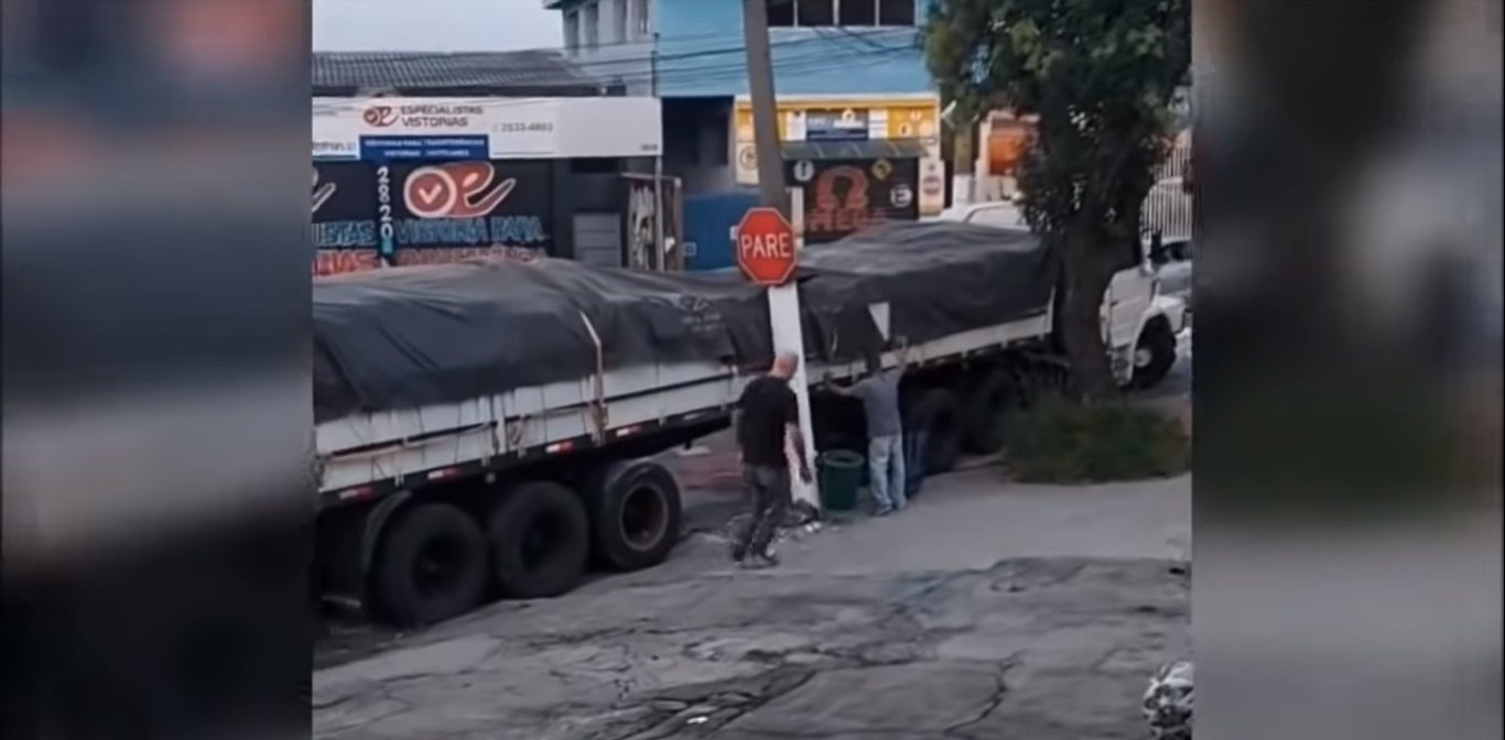 Vídeo que circula nas redes sociais mostra um motorista tentando manobrar seu caminhão com a ajuda de alguns pedestres que circulavam pelo local e viram que ele estava em apuros.