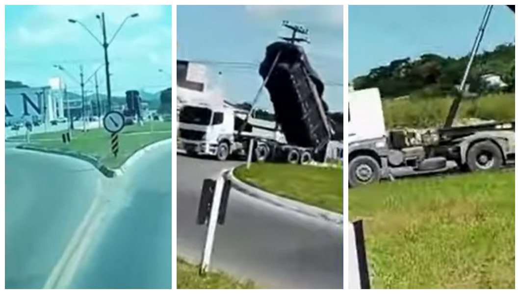 Uma cena inusitada foi flagrada por um motorista que passava na BR-280 em São Francisco do Sul, no estado de Santa Catarina. O vídeo mostra um caminhoneiro trafegando com a carreta basculada na via.