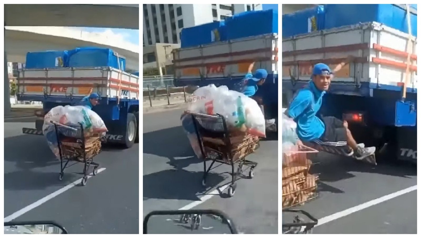 Em uma movimentada via de Belo Horizonte, um homem é flagrado pegando ‘rabeira’ em um caminhão, enquanto segura um carrinho de supermercado.