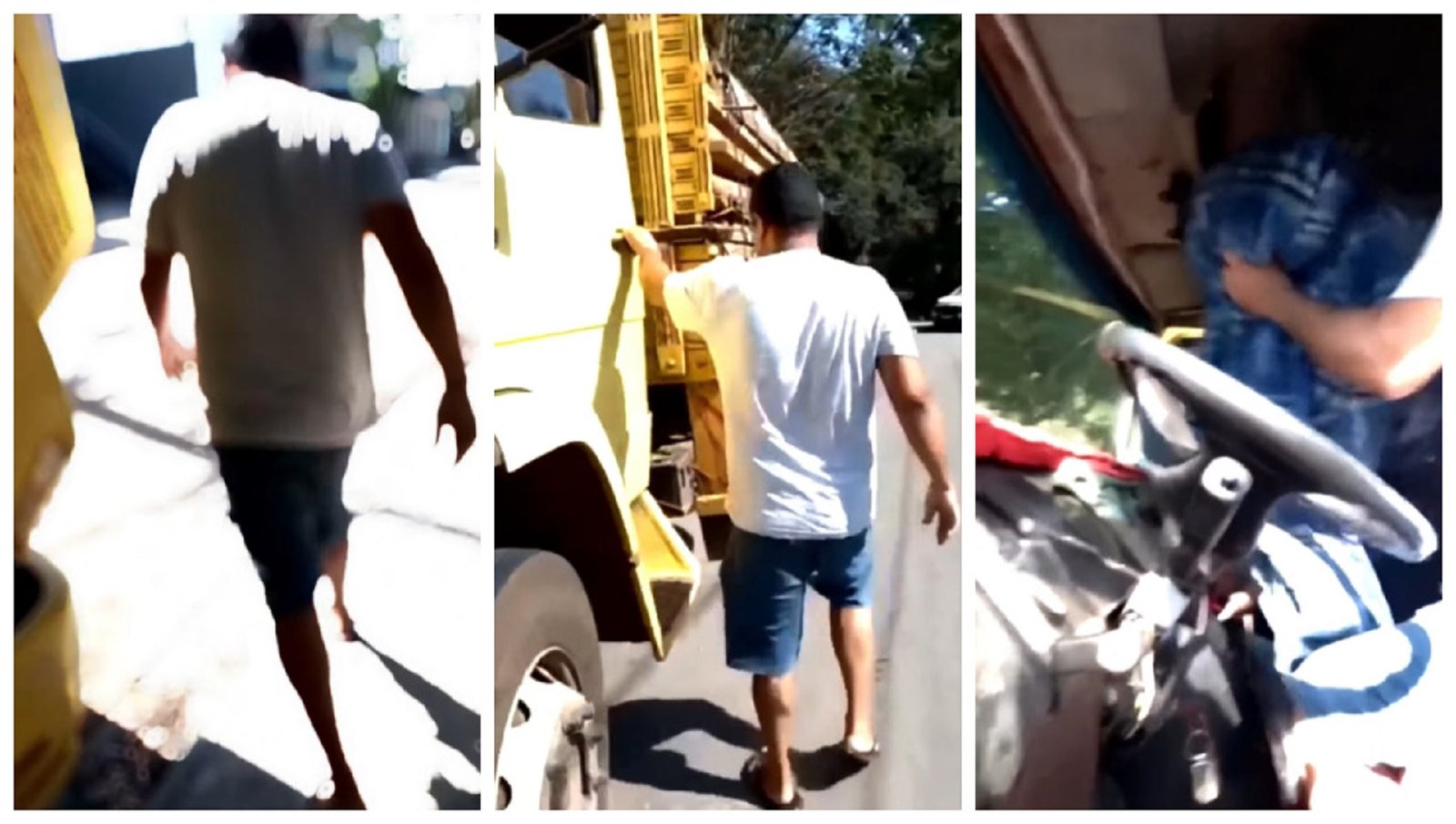 O motorista abre a porta do veículo e diz: “pega a faca aí, deixa eu dar uma facada, que ele vai ver como é que entra no carro dos outros”. Em seguida o caminhoneiro empurra o indivíduo para fora. O rapaz aparentava estar bêbado ou sofrer de algum distúrbio mental, pois ele não reage e nem pronuncia nenhuma palavra diante da investida do caminhoneiro.
