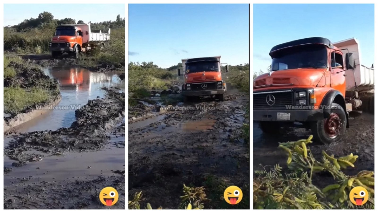 Ao que tudo indica, a caçamba estava vazia, mesmo assim, o profissional mostrou sua experiência e a resistência do Mercedes ao atravessar o lamaçal. Com o giro em alta, patinando e com lama até o para-choque do veículo, o trajeto foi realizado com sucesso.
