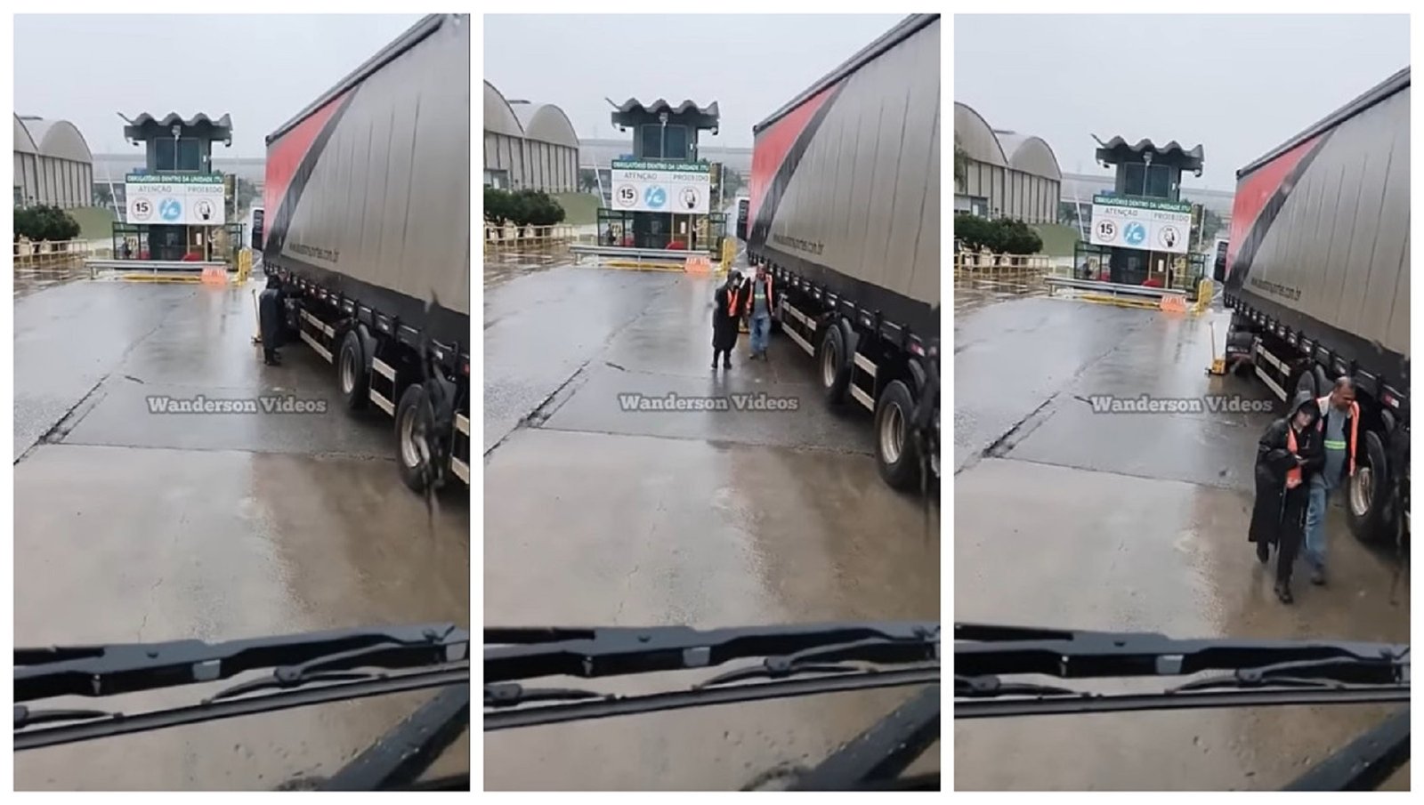 Um caminhoneiro ficou revoltado quando flagrou o colega tendo que descer do caminhão, na chuva, para acompanhar uma fiscal da empresa, que iria checar a caixa de cozinha do caminhão, antes do profissional entrar na empresa para carregar o veículo.