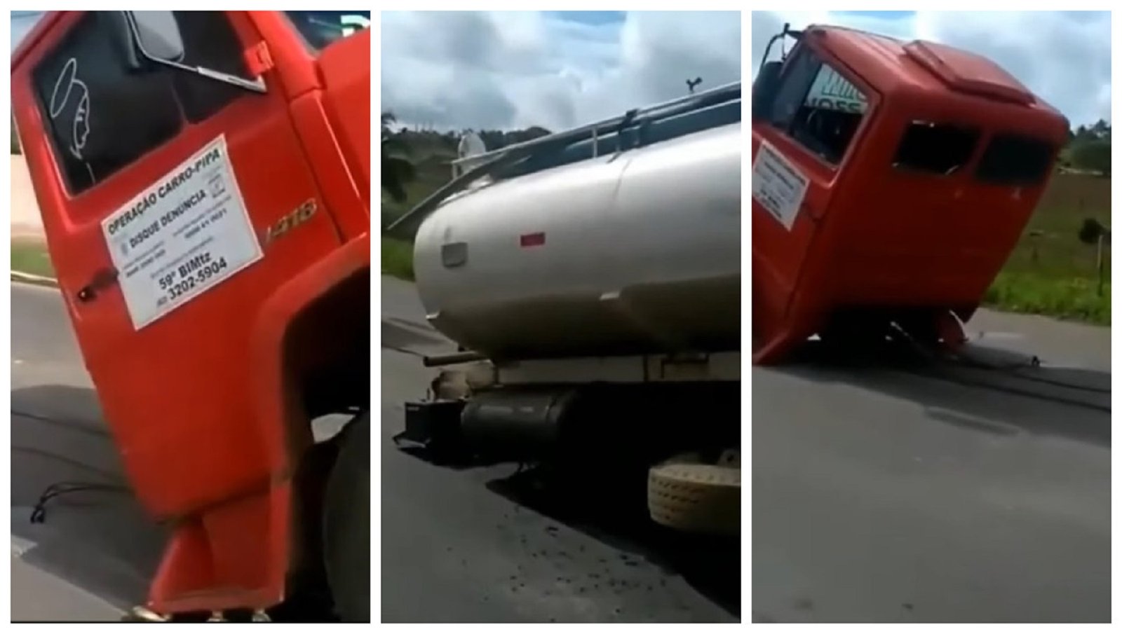 Uma cena inusitada está chamando a atenção na internet. Um caminhão-tanque, modelo L1318, da Mercedes, se partiu ao meio enquanto trafegava em uma rua.