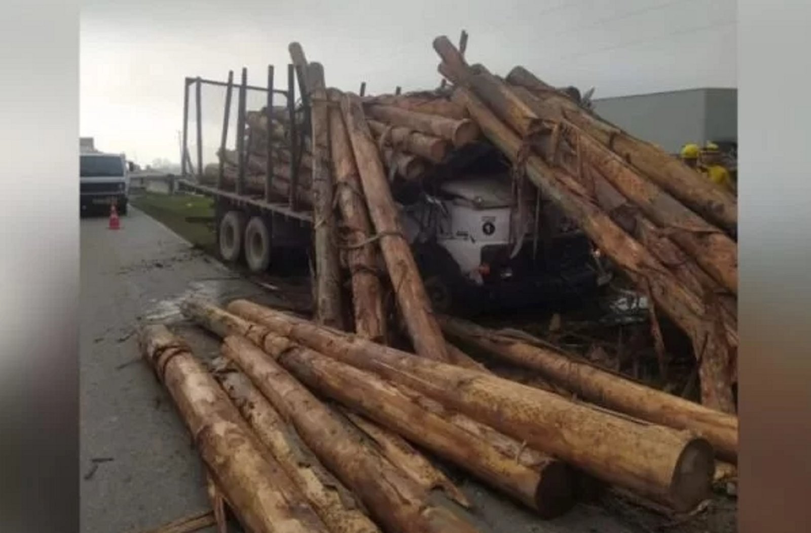 Uma câmera de segurança de um estabelecimento registrou o momento exato em que um caminhão carregado com toras de madeira freia bruscamente em uma rodovia. Diante disso, parte da carga é lançada à frente e acaba esmagando a cabine, levando a morte do caminhoneiro.