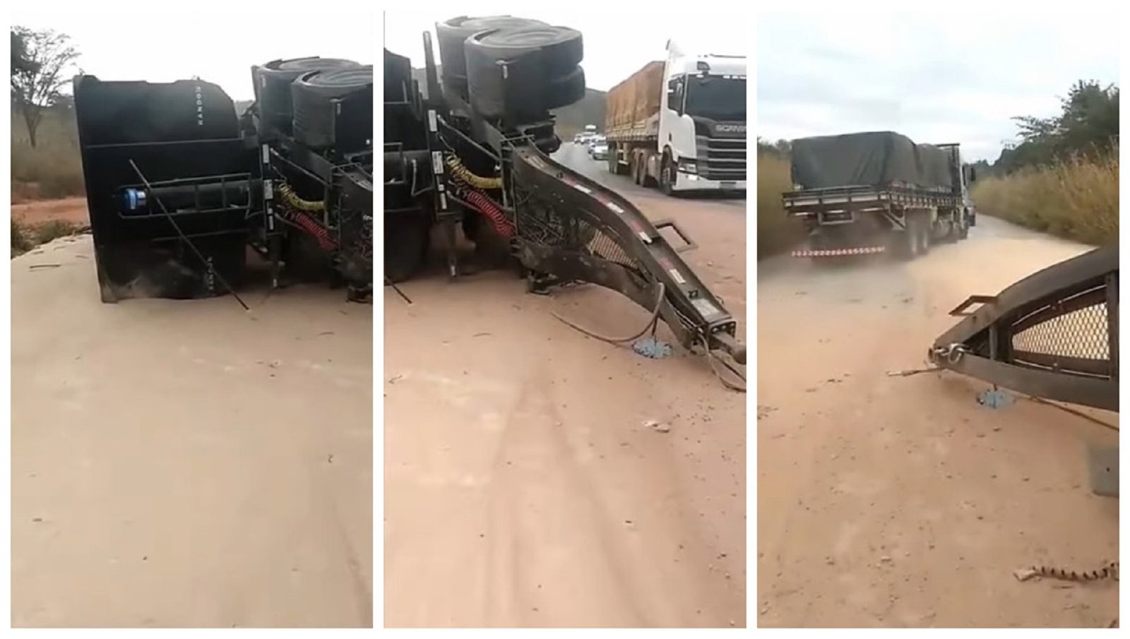 Circula na internet um vídeo de um semirreboque virado sobre a pista e com a carga esparramada ao seu redor. De acordo com informações, a cena foi registrada na BR-354 e o implemento rodoviário teria se soltado da carreta sem que o caminhoneiro percebesse, deixando o semirreboque para trás.