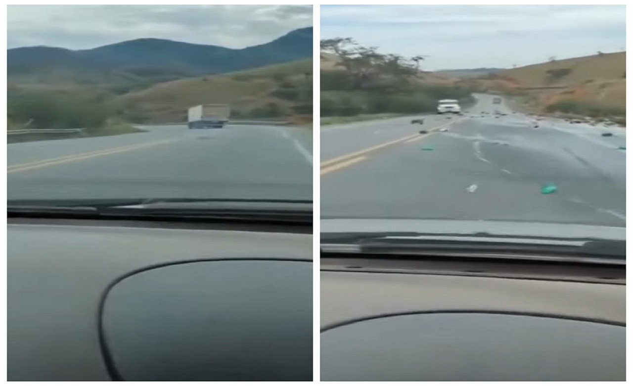Um carro de passeio que seguia logo atrás do caminhão testemunhou a situação e optou por documentar o incidente, capturando o momento em vídeo com um celular.