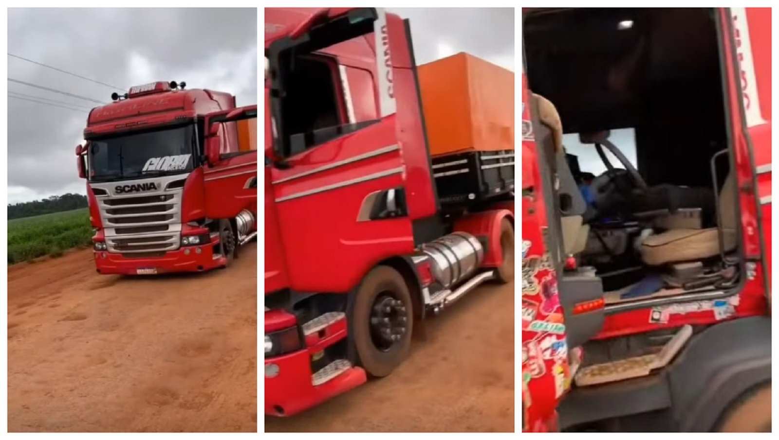 Uma carreta 9 eixos foi flagrada com a porta do lado do motorista aberta e andando sozinha em uma estrada de terra. Ao que tundo indica, o vídeo foi feito pelo próprio motorista, de fora da carreta.