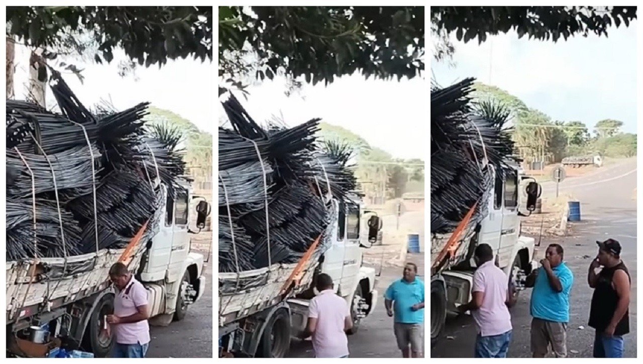 Contudo, o caminhoneiro ignorou o perigo e preparava um café embaixo da carga. Enquanto era filmado sem perceber, dois colegas se aproximam do veículo para conversar com o profissional e também se colocam numa situação de risco.