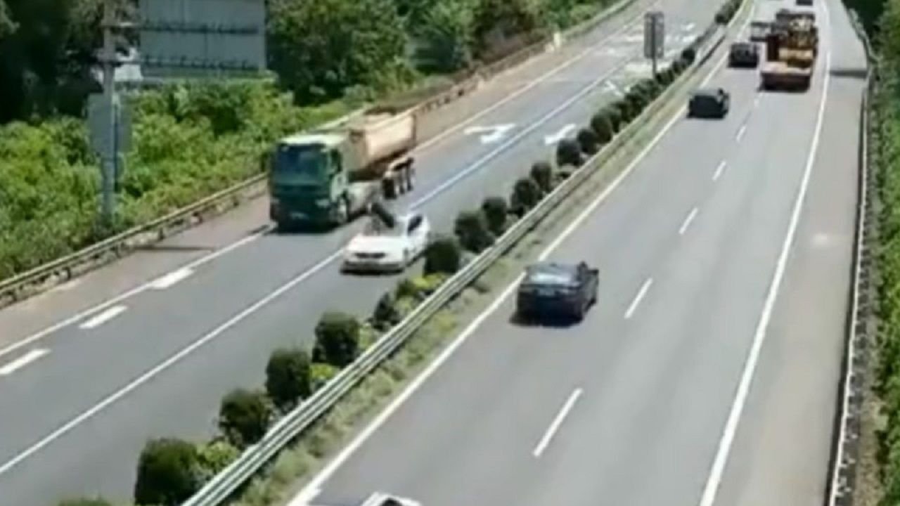 Uma câmera de segurança que monitorava uma rodovia na China registrou o exato momento em que um pneu se desprendeu de um caminhão e atingiu o para-brisa de outro veículo.