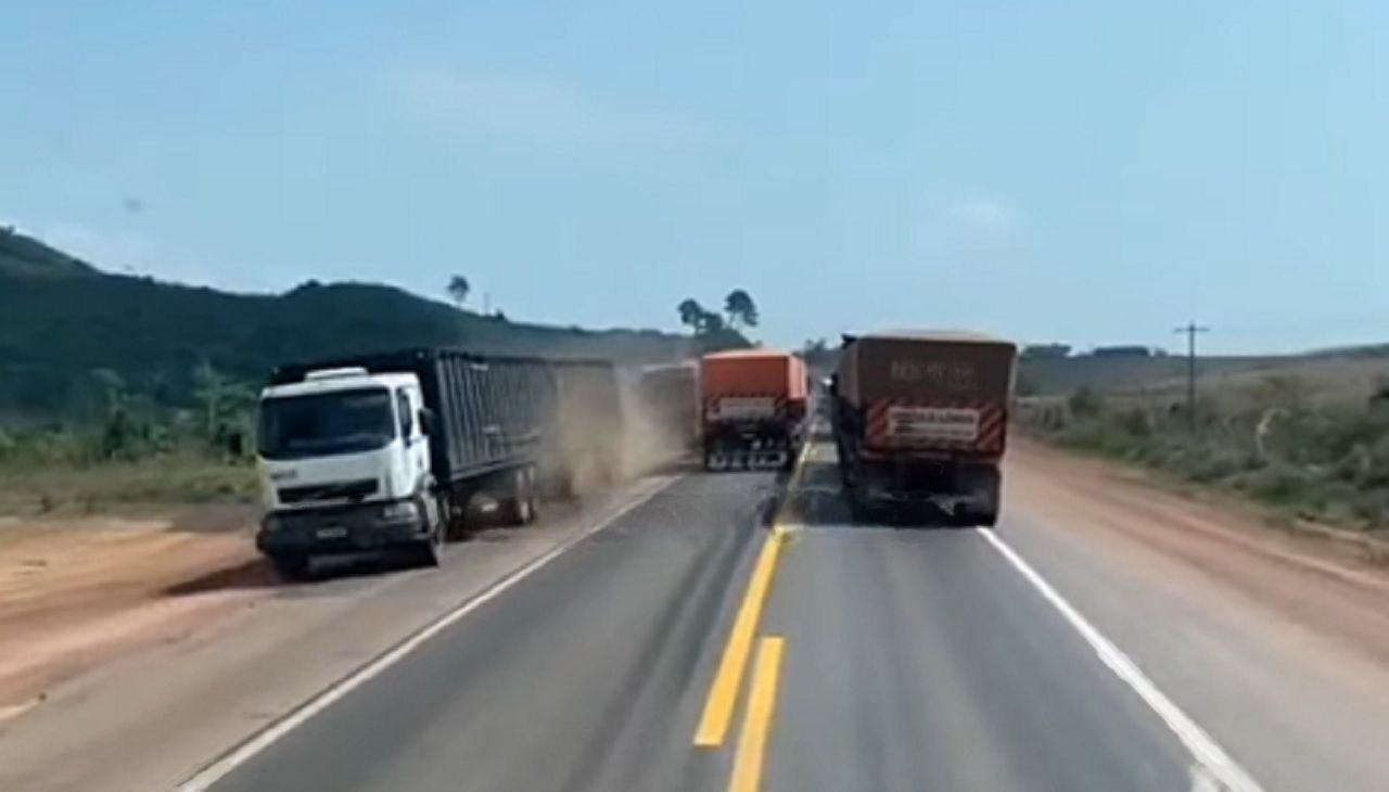 Um caminhoneiro foi flagrado realizando uma ultrapassagem perigosa em uma rodovia onde várias carretas estavam circulando. Além de executar a manobra no início de uma curva, ele obrigou três carretas a saírem da pista para evitar uma colisão frontal.