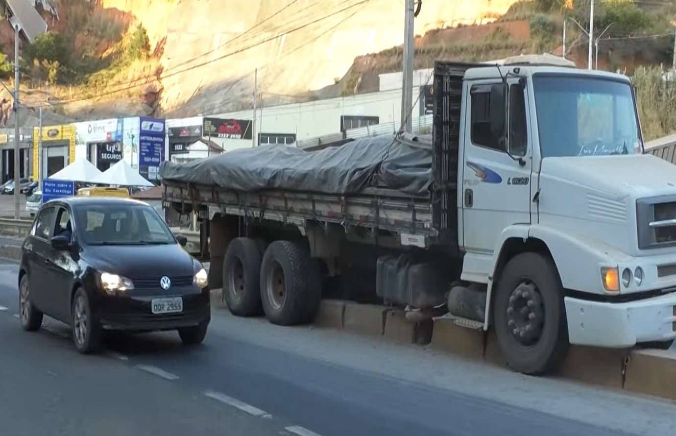Um caminhão acabou ficando preso em blocos de concreto na última segunda-feira (30) na BR-116, trecho no município de Caratinga, Minas Gerais.