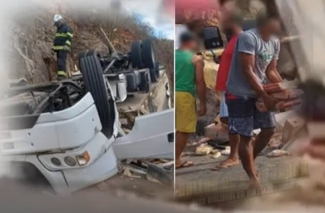 O veículo estava carregado de uma carga de frango congelado que acabou sendo saqueada pelos populares.