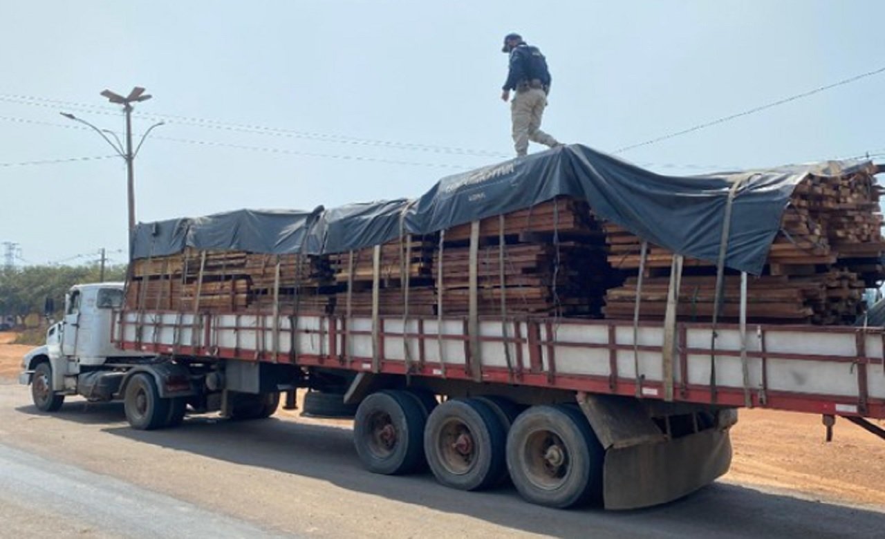Os policiais encontraram que a madeira transportada não estava declarada conforme o documento de origem florestal (DOF) emitido para a carga.