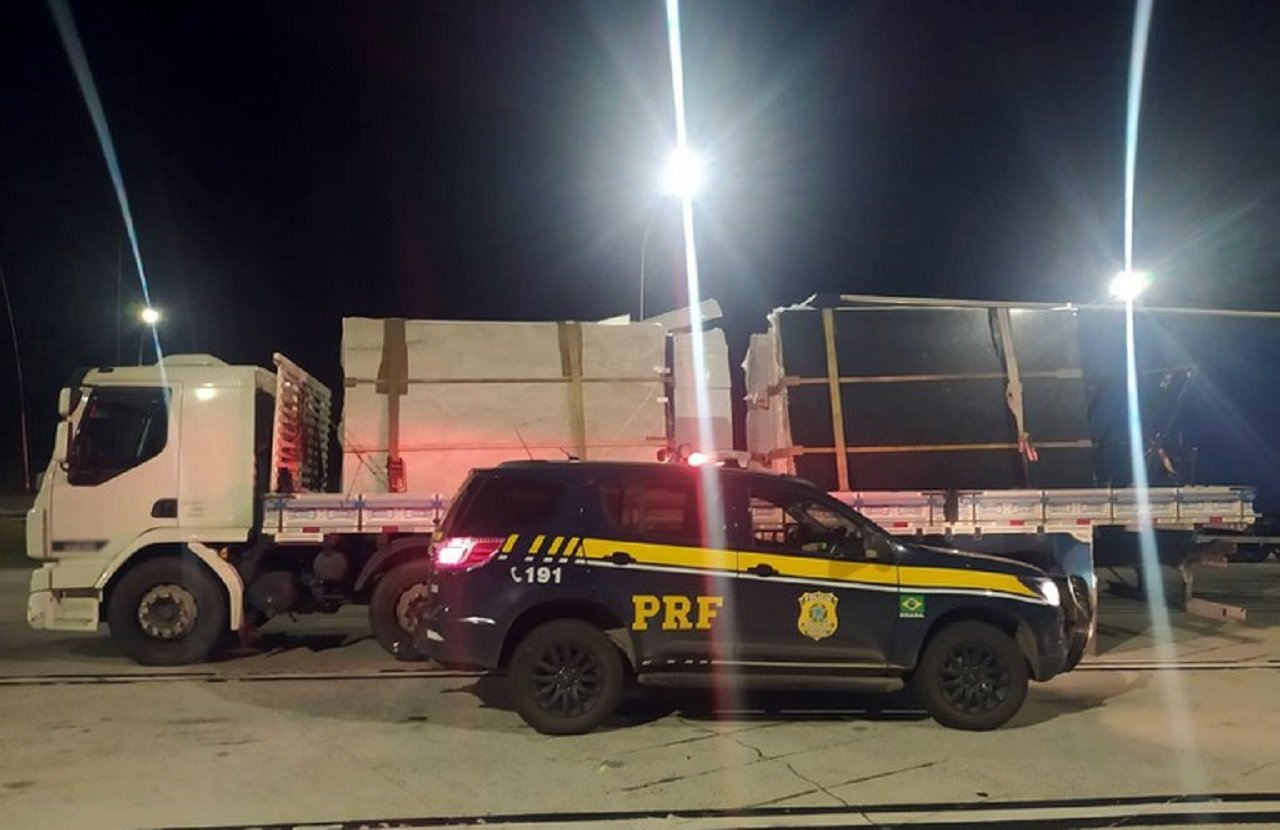 A Polícia Rodoviária Federal (PRF) flagrou caminhões que carregavam chapas de granito, porém com excesso de peso na última quarta-feira (18) enquanto passavam pela Rodovia Presidente Dutra.