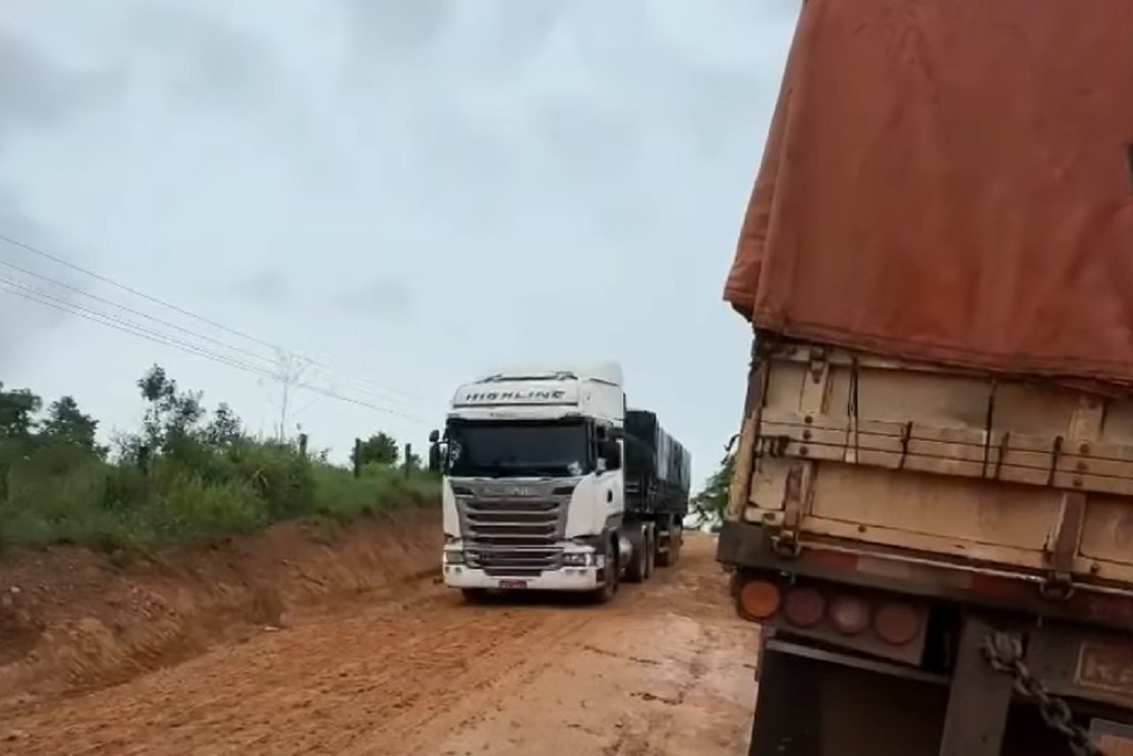 Enquanto filmava uma situação que já era precária, um dos caminhoneiros mostrava toda dificuldade do tráfego na estrada de chão molhada ainda se tratando de uma ladeira.