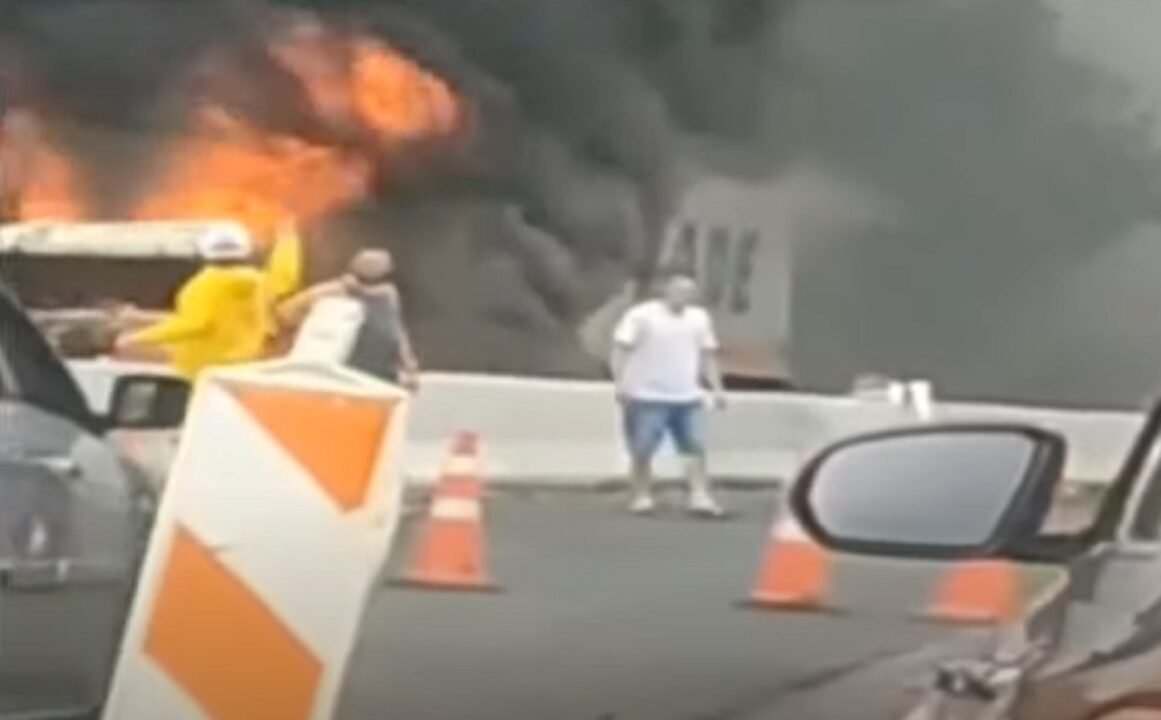 Após a colisão, o motorista do caminhão atingido foi ver o que tinha acontecido e tentou socorrer o rapaz, mas infelizmente ele estava preso às ferragens e o caminhão começou a pegar fogo.