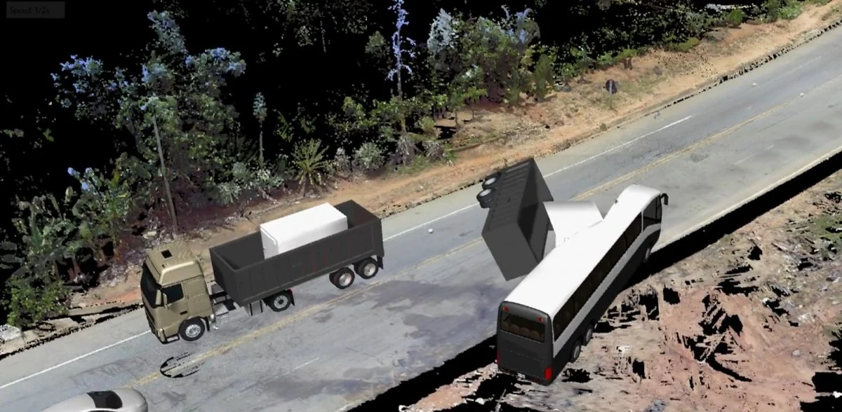 A reconstituição digital do acidente mostrou que, no momento em que o bloco se desprendeu, um caminhão que vinha no sentido contrário conseguiu desviar, mas o ônibus, que vinha logo atrás, foi atingido em cheio. O impacto gerou um incêndio devastador, resultando na tragédia.