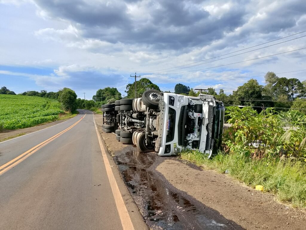 Na tarde deste sábado (22), por volta das 15h17, uma carreta carregada com frangos congelados tombou às margens da PRC-158, na região da comunidade de Campinas, em Chopinzinho (PR).