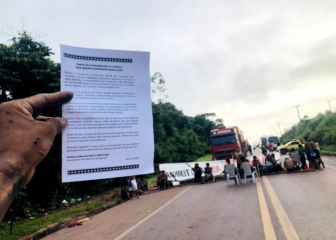 No 11º dia consecutivo de mobilização contra a Lei 14.701, que oficializa o marco temporal para demarcações de terras indígenas, os povos Munduruku reforçaram sua resistência nesta sexta-feira (4) entregando uma carta aos caminhoneiros que trafegam pela BR-163, no trecho de Itaituba (PA). O documento intitulado “Carta às comunidades e a todos que querem entender a nossa luta” busca explicar os motivos do bloqueio.