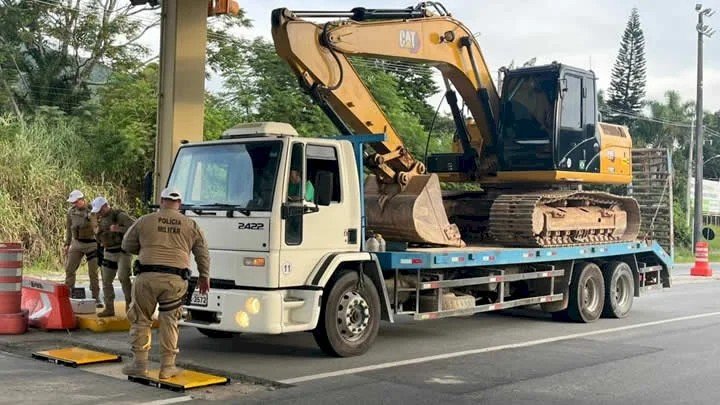 Durante a mesma ação, os agentes também flagraram um caminhão truck transportando uma escavadeira hidráulica com mais de cinco toneladas de excesso de peso. Como a carga era considerada indivisível, os policiais determinaram o transbordo da máquina para um veículo apropriado, com capacidade adequada para o transporte seguro.