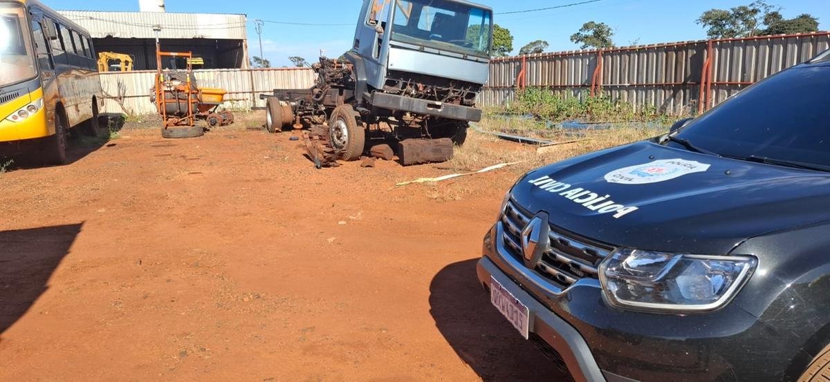 Durante o cumprimento de mandados de busca e apreensão, os policiais localizaram o caminhão totalmente desmontado em dois locais distintos: uma oficina autoelétrica e um terreno na zona urbana de Santa Vitória. Além do veículo, também foram apreendidos diversos componentes que já haviam sido retirados e, possivelmente, vendidos.