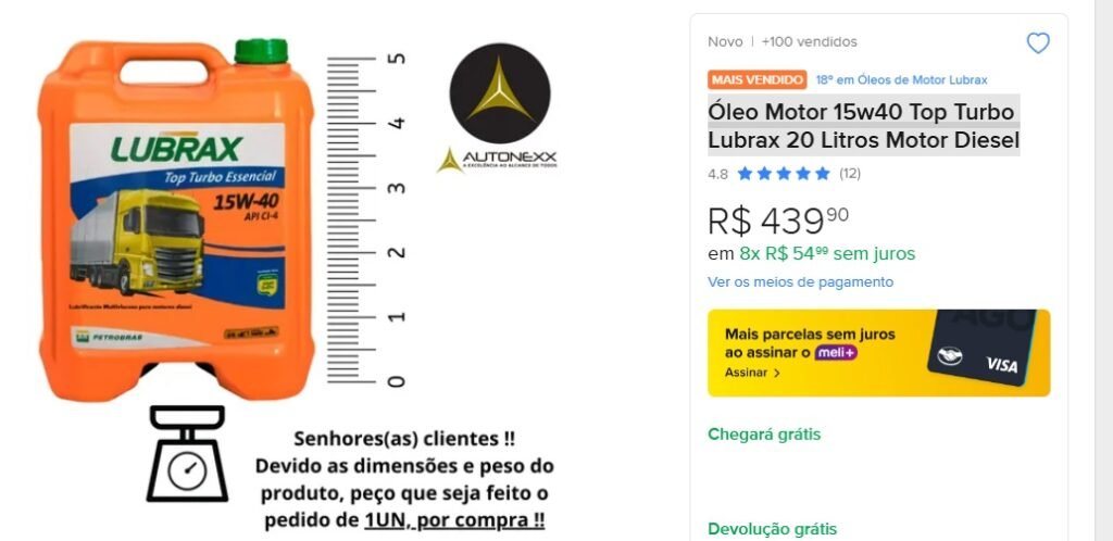 - Volume: Embalagem com 20 litros, o que representa ótimo custo-benefício para quem realiza trocas regulares ou precisa abastecer mais de um motor.