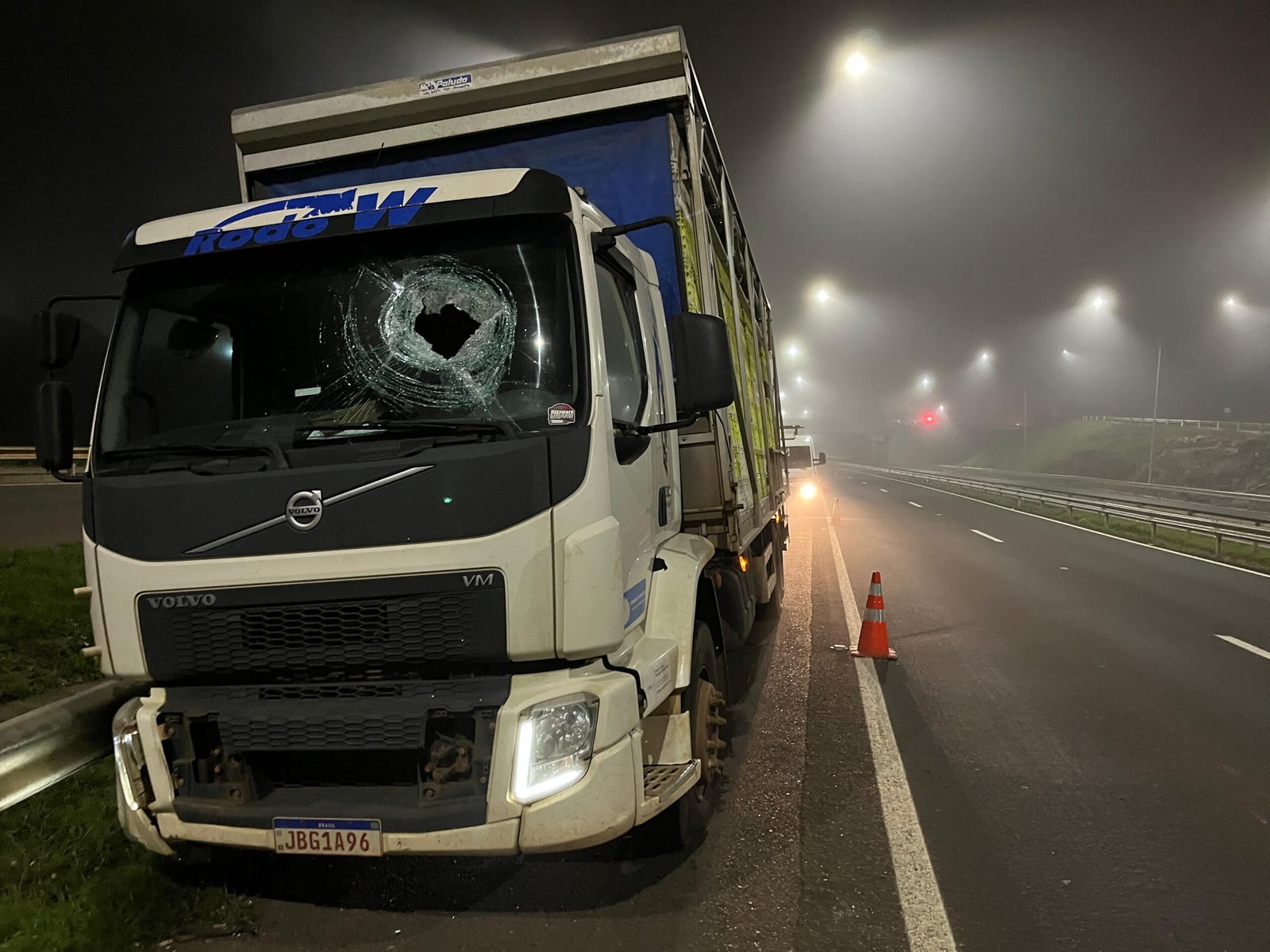 A CCR ViaSul informou que o chamado foi registrado às 4h44 e que uma faixa da rodovia ficou bloqueada até as 7h30 para o atendimento da ocorrência. Imagens do sistema de monitoramento da concessionária serão utilizadas para tentar esclarecer o trajeto da pedra até o impacto no caminhão.