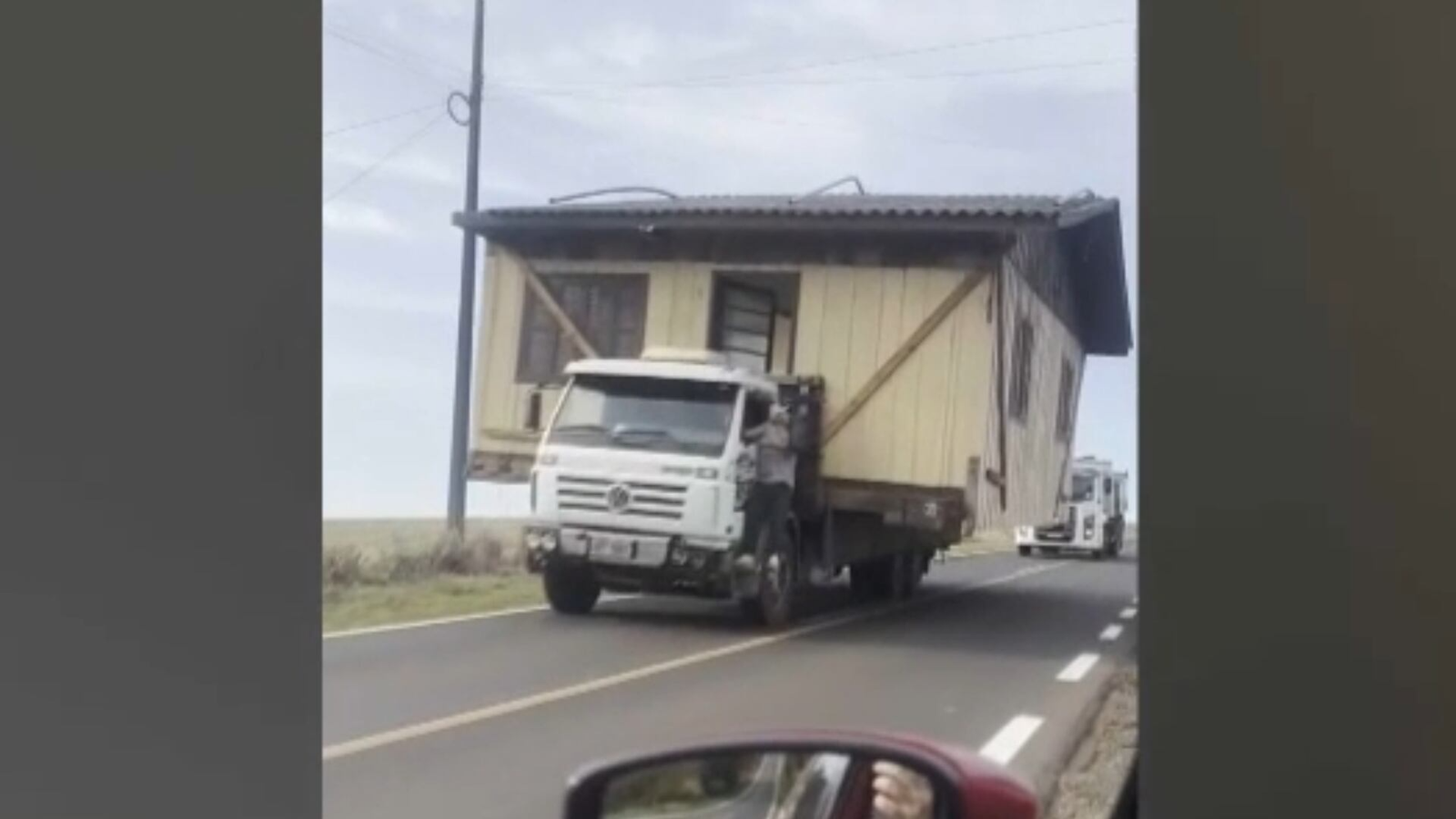 ntre Dois Vizinhos e Cruzeiro do Iguaçu, no sudoeste do Paraná, motoristas ficaram surpresos ao flagrar um caminhão carregando uma casa de madeira completa como se fosse carga comum. A cena inusitada foi registrada por um morador e compartilhada nas redes sociais, gerando repercussão nesta quarta-feira (7).