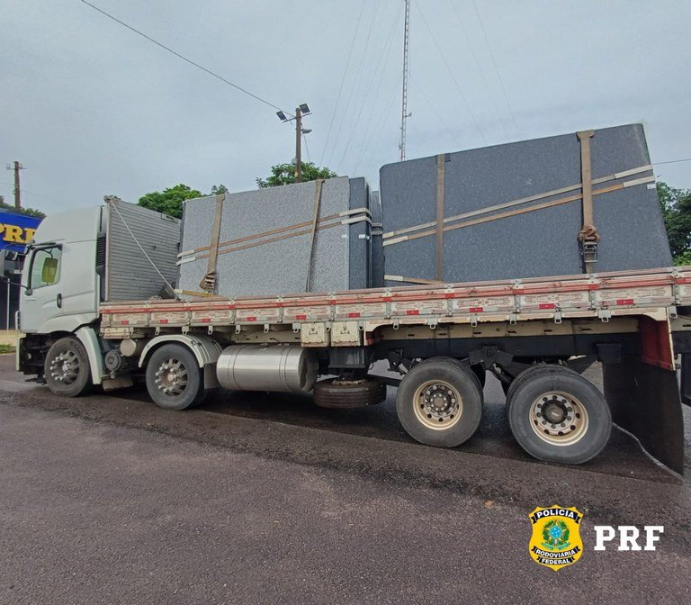 O caminhão levava cerca de 100 placas de granito. Quando o veículo passou pela balança, foi confirmado um excesso de peso de quase 20 toneladas acima do permitido.