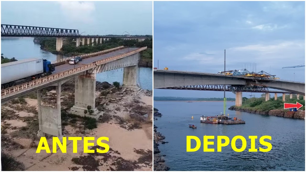 Nesta semana,vídeos gravados com drone revelam o andamento das obras. De um lado, em Aguiarnópolis, continuam os trabalhos nos gabiões – aqueles blocos de pedra que sustentam o aterro. No caminho para Estreito, por outro lado, tudo vai num ritmo quase igual: o centro da ponte está equilibrado dos dois lados, com retirada da treliça móvel, limpeza na plataforma e serviço de reforço espalhado aqui e ali.