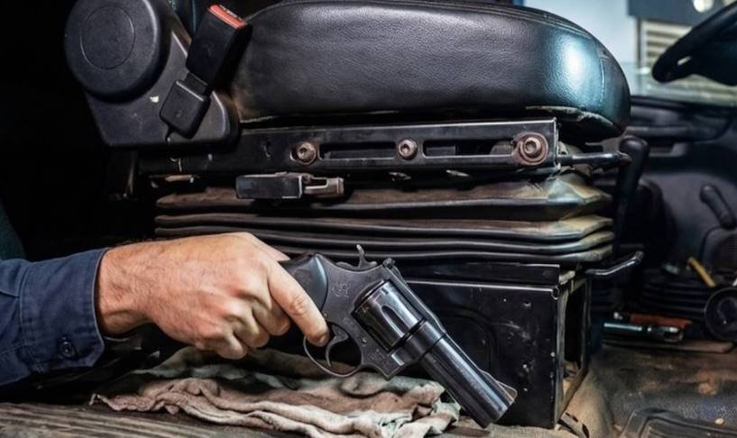 Durante a vistoria, os policiais encontraram um revólver calibre .38 escondido embaixo do banco do motorista. A arma estava sem munição.