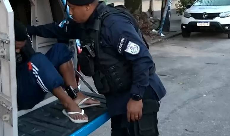 O suspeito preso foi identificado como Allan Ferreira, de 28 anos. Ele usava tornozeleira eletrônica e deveria estar cumprindo prisão domiciliar no momento do crime.