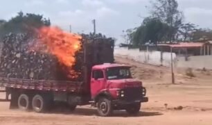 Motorista joga caminhão em rio para apagar incêndio em carga de madeira no Ceará