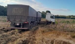 Caminhão sai da pista e para em lavoura às margens da SC-161, em Palma Sola