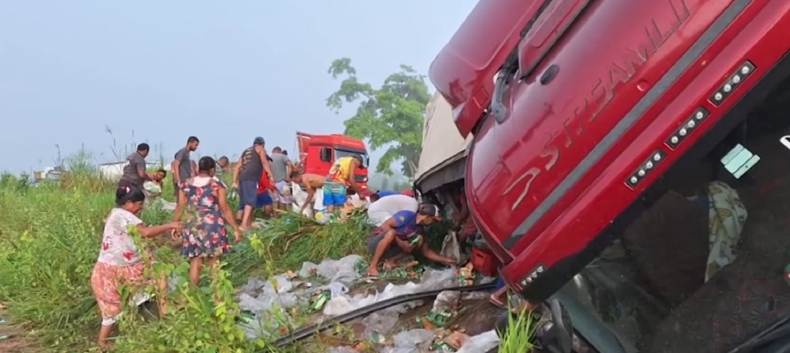 O veículo havia tombando na rodovia e populares da região saquearam a carga mesmo arriscando suas vidas.